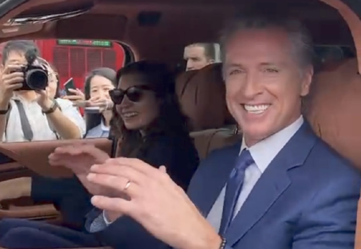 2023年10月创通网,加州州长纽森在深圳试驾比亚迪电动汽车,桑切斯(左)当时是他的州长办公室高级气候顾问。深圳卫视深视新闻
